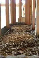 - Le mortier : Il est issu des recherches sur le bois cordé[19]. Il est composé de sable (3 volumes), de sciure de bois (4 volumes), de chaux aérienne (1 volume) et de ciment (1 volume) il est versé dans l'espace entre la paille et le coffrage. Il est ensuite vibré manuellement.