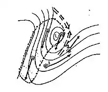 - La différence de hauteur de la 500 hPa pour des points situés à 7,5 degrés de latitude de part et d'autre de la dépression de surface. On mesure perpendiculairement au courant et on n'inclut que les contours ouverts