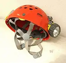 L'équipement du spéléologue comprend un éclairage de secours par individu. Celui-ci est souvent porté sur le casque ou autour du cou, permettant ainsi de l'activer même si le spéléologue progresse sur corde.