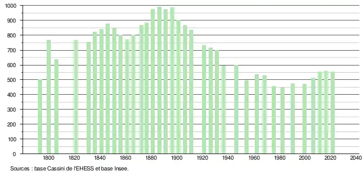L'évolution du nombre d'habitants est connue à travers les recensements de la population effectués dans la commune depuis 1793. Pour les communes de moins de 10 000 habitants, une enquête de recensement portant sur toute la population est réalisée tous les cinq ans, les populations légales des années intermédiaires étant quant à elles estimées par interpolation ou extrapolation[23]. Pour la commune, le premier recensement exhaustif entrant dans le cadre du nouveau dispositif a été réalisé en 2006[24].