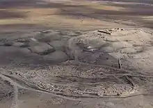 - Au Bronze ancien II (niveau III et II) la cité est puissamment fortifiée. L'allure générale de l'enceinte est celle d'un fer à cheval. Ses murs couvrent une distance de 1 200 m et ont 2 à 2,5 m d'épaisseur. Ils sont en pierre, abondante dans la zone, alors que les briques demanderaient trop d'eau. Une quarantaine de tours semi-circulaires sont aménagées le long des murailles, à raison d'une tour tous les 20 à 25 mètres. L'ensemble montre que ses habitants ont réalisé des efforts importants pour fortifier la ville.
