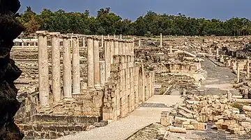 Beït-Shéan est mentionné dans la Bible, au premier livre de Samuel lorsque les Philistins déposent le corps de Saül, tué au combat, sur les murailles de la ville, construites alors au sommet du tel (et non pas celles situées au bas du tel, datant de l'époque romaine)[4]. En effet, le peuplement sur le sommet du tel se poursuit jusqu'à l'invasion romaine, après laquelle les constructions apparaissent en contrebas du tel, dans la vallée de Beït-Shéan, et comprenant dans le pur style romain des bâtiments publics, des temples, des bains, un théâtre, des rues et des habitations.