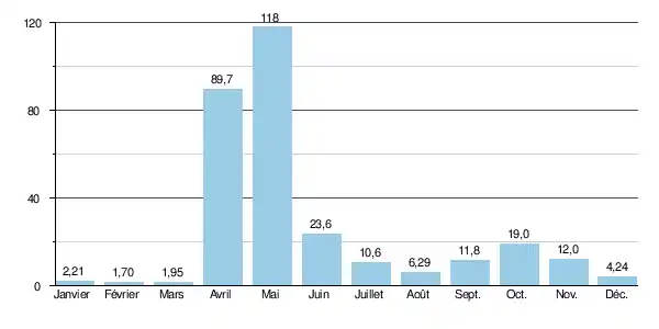 Le débit moyen mensuel observé en février (minimum d'étiage) est de 1,70 m3/s, soit plus ou moins de 1,5 % du débit moyen du mois de mai (118 m3/s), ce qui souligne l'amplitude très importante des variations saisonnières. Ces écarts de débit mensuel peuvent être plus marqués encore d'après les années : sur la durée d'observation de 43 ans, le débit mensuel minimal a été de 0,54 m3/s en et en , tandis que le débit mensuel maximal s'élevait à 262 m3/s en .