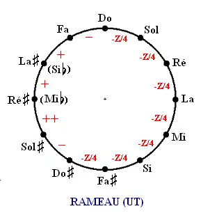 - Le comma pythagoricien est réparti par quarts sur 4 quintes (qui deviennent ainsi un peu courtes) : Do-Sol, Sol-Ré, Ré-La et Si-Sol.