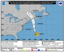 À 15 h UTC le , le NHC l'a déclaré cyclone post-tropical, à 180 km au sud des Bermudes[13]. Le centre est passé à environ 40 km de l'archipel plus tard en journée[14]. L'ex-Philippe a poursuivi vers le nord et ses pluies ont commencé à tomber sur la Nouvelle-Angleterre et les provinces maritimes du Canada en après-midi du . Le centre a touché la côte du Maine à l'ouest de Bar Harbor vers 6 h UTC le [15]. Dans le rapport du National Hurricane Center publié le , une réanalyse météorologique a montré que la transformation post-tropicale de Philippe a été absorbée par une dépression non tropicale plus au nord et que c'est ce système qui a touché le Maine[16]. Cette tempête a traversé ensuite le Maine pour fusionner avec un autre système à l'est de Québec au Canada.