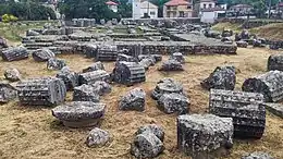 À l’intérieur, on a 14 demi-colonnes avec des chapiteaux corinthiens, sept de chaque côté. Les 14 fragments de chapiteaux présentent une finition et un travail exemplaires. Malgré la présence de fondations centrales, on peut être certain qu’il n’y avait pas de colonnade intérieure, et que ces fondations sont largement postérieures au IVe siècle av. J.-C.[4]:45.