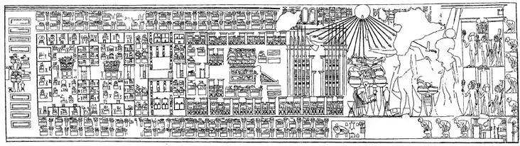 La famille passe alors les pylônes et monte les marches jusqu'au maître-autel où sont offerts la viande, les volailles, les légumes et les fleurs accompagnés de trois pots d'encens[1]. Pendant que le pharaon et la reine officient, les prêtres placent des offrandes sur les autres autels pour le peuple tandis que de la musique joue.