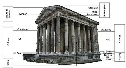 L'édifice s'élevait au cœur de la ville dans le forum viennois qui était une grande place dallée entourée de portiques. Positionné à l'ouest dans l'aire sacrée, il faisait face à la basilique. C'est le schéma classique du forum tripartite connu ailleurs en Gaule[Note 1]. Ainsi, le temple est orienté sur un axe est-ouest presque parfait. Ce temple sine postico présente sur sa façade orientale six colonnes. Les longs côtés sud et nord présentent chacun six colonnes et deux pilastres alors que le mur fermant le temple à l'ouest est bordé par deux autres pilastres. L'ensemble s'élève sur un haut podium et on accède au temple et à la cella, entièrement reconstruite, par un escalier lui aussi restitué. Deux états de construction ont été mis en évidence à partir des différences ornementales au vu de l'utilisation de différents matériaux. De l'édifice primitif construit en pierre du Midi, il ne reste que la partie arrière, soit le mur en grand appareil à l'ouest, les deux pilastres d'angle, les deux retours avec les pilastres au nord et au sud ainsi que les deux premières colonnes de ces longs côtés. Les chapiteaux corinthiens allongés, formés de deux assises, présentent des acanthes charbonneuses et plaquées sur la corbeille, les hélices et les crosses sont grêles et débordent largement des feuilles du calice. Les modillons de la corniche sont, pour cet état, décorés. Ce premier état est daté par comparaison avec la Maison carrée de Nîmes, le temple romain de Château-Bas à Vernègues et d'autres édifices en Narbonnaise, du dernier quart du Ier siècle de notre ère. La plus grande partie de l'édifice est reconstruite dans un deuxième temps avec de nouveaux matériaux (pierre de Seyssel et choin). Les chapiteaux sont notamment différents avec des acanthes modelées de façon plus[B 1] naturelle, des feuilles lisses et des nervures marquées au trépan[B 2].