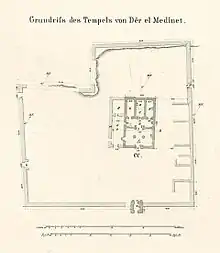 Le temple lui-même est un édifice rectangulaire en grès[4] orienté selon un axe sud-est/nord-ouest[5]. Le bâtiment s'ouvre sur un péristyle formé de colonnes lotiforme et papyriforme. Le péristyle est suivi d'un pronaos contenant plusieurs piliers ornés de la tête de la déesse Hathor[2]. Un escalier dans le pronaos permet d'accéder au toit du temple[5]. Le naos au fond du bâtiment est divisé en trois chapelles où étaient vénérés Hathor, et dans une moindre mesure, Maât, la triade de Thèbes et la triade de Médamoud[2]. Imhotep et Amenhotep fils de Hapou, deux grands savants en leur temps déifiés après leur mort, sont aussi représentés dans le temple[8].