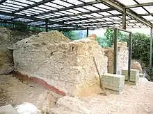 Des traces de plâtre ont été retrouvées exclusivement dans la partie basse de la maçonnerie. L'ensemble de la structure a été recouvert d'une toiture pour protéger le site des agents atmosphériques[3].