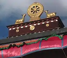 Sur le toit, deux daims encadrent une roue du dharma, symbole bouddhique[23].