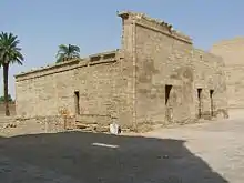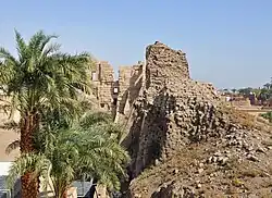 Plutôt bien conservé, il est entouré d'une enceinte de briques en terre crue qui a peut-être été fortifiée et qui enserre l'ensemble des monuments du site. Signe des temps, (Ramsès III eut à repousser dès l’an cinq de son règne une invasion du pays), le roi décida de garantir la sécurité de sa fondation jubilaire par une puissante enceinte comprenant uniquement deux accès à l’ouest et à l’est.