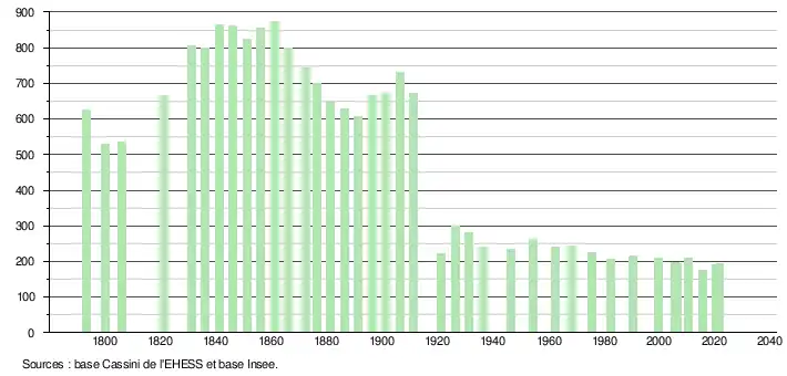 L'évolution du nombre d'habitants est connue à travers les recensements de la population effectués dans la commune depuis 1793. Pour les communes de moins de 10 000 habitants, une enquête de recensement portant sur toute la population est réalisée tous les cinq ans, les populations légales des années intermédiaires étant quant à elles estimées par interpolation ou extrapolation[32]. Pour la commune, le premier recensement exhaustif entrant dans le cadre du nouveau dispositif a été réalisé en 2005[33].