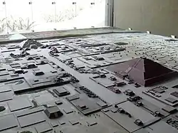 Les styles architecturaux prédominant à Teotihuacan se retrouvent dans un certain nombre de sites mésoaméricains éloignés, ce que certains chercheurs ont interprété comme une preuve d'interactions profondes avec Teotihuacan ou d'une domination politique et militaire[55]. Un style particulier associé à Teotihuacan, connu sous le nom de talud-tablero, est un module dans lequel un soubassement en talus sur le côté extérieur d'une structure (talud) est surmonté par un panneau vertical rectangulaire en saillie (tablero). Les variantes de ce style générique se rencontrent dans un certain nombre de sites de la zone maya, parmi lesquels Tikal, Kaminaljuyu, Copan, Becan et Oxkintok, en particulier dans le bassin de Petén et les hautes terres du centre du Guatemala[56],[57]. Le style talud-tablero a fait sa première apparition à Teotihuacan au début de l'époque classique et il semble avoir son origine dans la région de Tlaxcala-Puebla au cours de la période préclassique[58]. Des analyses ont retracé le développement des variantes locales du style talud-tablero sur des sites comme Tikal, où son utilisation précède l'apparition au Ve siècle de motifs iconographiques partagés par Teotihuacan. Le style talud-tablero s'est diffusé dans toute la Mésoamérique, à partir de la fin de la période préclassique, et non pas spécifiquement, ou seulement, par le biais de l'influence de Teotihuacan. On ne sait pas comment, ni à partir d'où, le style s'est propagé dans la région maya[58],[59].