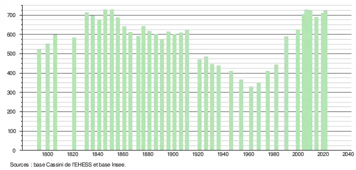 L'évolution du nombre d'habitants est connue à travers les recensements de la population effectués dans la commune depuis 1793. Pour les communes de moins de 10 000 habitants, une enquête de recensement portant sur toute la population est réalisée tous les cinq ans, les populations légales des années intermédiaires étant quant à elles estimées par interpolation ou extrapolation[14]. Pour la commune, le premier recensement exhaustif entrant dans le cadre du nouveau dispositif a été réalisé en 2004[15].