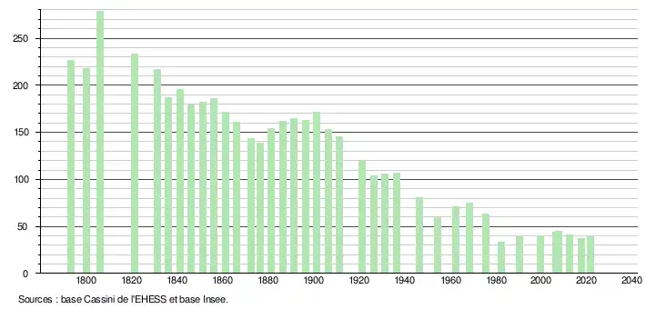 L'évolution du nombre d'habitants est connue à travers les recensements de la population effectués dans la commune depuis 1793. Pour les communes de moins de 10 000 habitants, une enquête de recensement portant sur toute la population est réalisée tous les cinq ans, les populations légales des années intermédiaires étant quant à elles estimées par interpolation ou extrapolation[17]. Pour la commune, le premier recensement exhaustif entrant dans le cadre du nouveau dispositif a été réalisé en 2007[18].