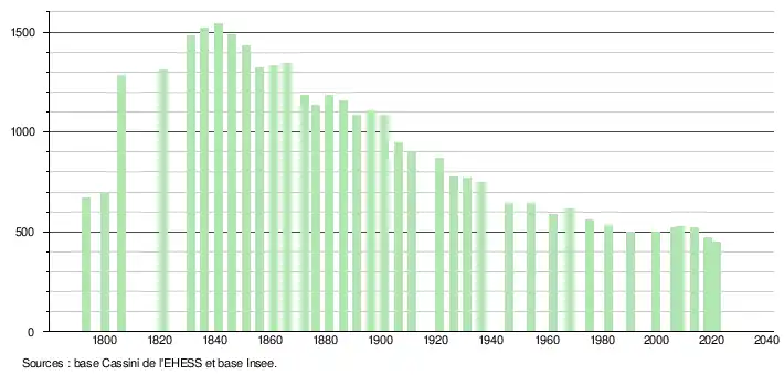 L'évolution du nombre d'habitants est connue à travers les recensements de la population effectués dans la commune depuis 1793. Pour les communes de moins de 10 000 habitants, une enquête de recensement portant sur toute la population est réalisée tous les cinq ans, les populations légales des années intermédiaires étant quant à elles estimées par interpolation ou extrapolation[22]. Pour la commune, le premier recensement exhaustif entrant dans le cadre du nouveau dispositif a été réalisé en 2008[23].