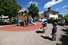 Les terrains de jeux sont apparus au tournant du XIXe siècle, dans le but de canaliser l'énergie des jeunes enfants et d'éviter la montée de la criminalité. D'abord apparu dans ces centres sociaux à destination des orphelins de guerre, notamment, avec les jardins d'enfants de Friedrich Fröbel, avec le premier en 1837 à Bad Blankenburg. Il pense que les enfants peuvent apprendre mieux par le jeu que par des exercices rébarbatifs et reprend en ce sens les travaux sur la pédagogie de Johann Heinrich Pestalozzi. Il y déploie des jouets aux formes abstraites, ludiques et pédagogiques. différents jeux de mouvements y sont également pratiqués, dont la danse, la course et les comptines mimées. Le jardinage est également pratiqué pour que l'enfant comprenne l'importance des soins et la façon dont les corps grandissent. Ces méthodes ont ensuite inspirées Maria Montessori, Rudolf Steiner ou Célestin Freinet[1].