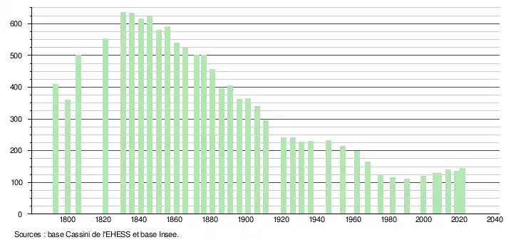 L'évolution du nombre d'habitants est connue à travers les recensements de la population effectués dans la commune depuis 1793. Pour les communes de moins de 10 000 habitants, une enquête de recensement portant sur toute la population est réalisée tous les cinq ans, les populations légales des années intermédiaires étant quant à elles estimées par interpolation ou extrapolation[28]. Pour la commune, le premier recensement exhaustif entrant dans le cadre du nouveau dispositif a été réalisé en 2008[29].
