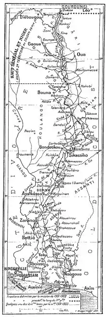 En ce qui concerne la frontière occidentale, la question de Gyaman et les revendications territoriales associées des deux puissances royales, la France et le Royaume-Uni, ont empêché un accord rapide. Ce n'est qu'après d'âpres négociations diplomatiques qu'il a été convenu d'une commission mixte des frontières, qui devait parcourir les zones en 1902/1903 et fixer la frontière franco-britannique entre la côte maritime et le 11e degré de latitude nord, ce qui s'est alors produit. Le tracé de la frontière convenu à l'époque forme encore essentiellement la frontière ouest du Ghana avec la Côte d'Ivoire et dans la partie nord avec l'actuel Burkina Faso.