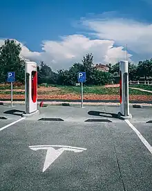 Tesla possède en propre la majorité des stations Superchargeurs, et le reste appartient à des opérateurs de flotte pour charger leurs véhicules Tesla, les compagnies de taxis par exemple. La puissance de ces bornes est limitée à 60 kW[40]. En , Tesla a modifié ses conditions de service pour interdire aux véhicules non personnels (les véhicles à usage commercial, comme les taxis, les véhicules de société, les véhicules gouvernementaux,...) d'utiliser les Superchargeurs. Cette interdiction s'applique uniquement aux véhicules achetés après le . D'autres options de recharge seraient proposées pour ces véhicules[41],[42].