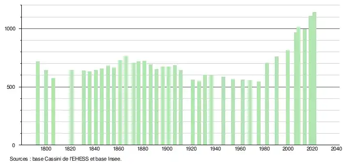 L'évolution du nombre d'habitants est connue à travers les recensements de la population effectués dans la commune depuis 1793. Pour les communes de moins de 10 000 habitants, une enquête de recensement portant sur toute la population est réalisée tous les cinq ans, les populations légales des années intermédiaires étant quant à elles estimées par interpolation ou extrapolation[20]. Pour la commune, le premier recensement exhaustif entrant dans le cadre du nouveau dispositif a été réalisé en 2008[21].