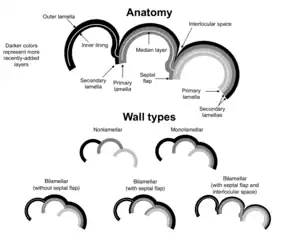 Les parois des tests bilamellaires peuvent être encore divisées entre celles avec des volets septaux (une couche de la paroi du test recouvrant le septum précédemment secrété) et celles n'ayant pas de volets septaux. Les volets septaux sont connus chez tous les foraminifères autres que ceux avec des parois bilamellaires.
