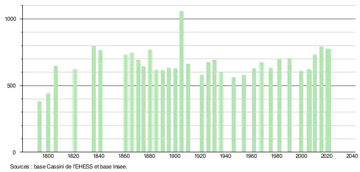 L'évolution du nombre d'habitants est connue à travers les recensements de la population effectués dans la commune depuis 1793. Pour les communes de moins de 10 000 habitants, une enquête de recensement portant sur toute la population est réalisée tous les cinq ans, les populations légales des années intermédiaires étant quant à elles estimées par interpolation ou extrapolation[18]. Pour la commune, le premier recensement exhaustif entrant dans le cadre du nouveau dispositif a été réalisé en 2005[19].