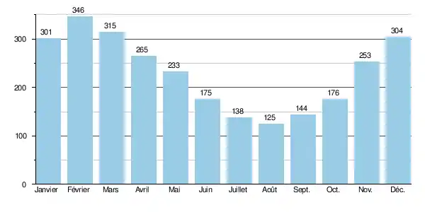 Sur la période d'observation de 59 ans, le débit mensuel minimal a été de 76 m3/s en août 1946, ce qui restait fort confortable ; le débit mensuel maximal, quant à lui, s'est élevé à 1 015 m3/s en décembre 1937.