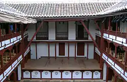 Le corral de comedias est aménagé dans l’espace clos, rectangulaire et à ciel ouvert de la cour centrale d’un groupe de maisons. La scène est disposée à une extrémité ; des loges et des galeries sur plusieurs étages occupent les trois autres côtés. La scène et les galeries sont protégées par un toit en surplomb. La cour centrale, ou patio, forme un parterre à ciel ouvert.