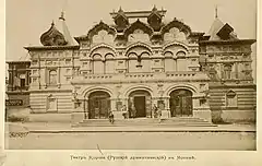 Au début, le théâtre était situé dans un bâtiment de la rue Kamergerski (qui abrite aujourd'hui le Théâtre d'art de Moscou). En 1885, le théâtre Korch déménage dans un bâtiment en style néo-russe construit sur les plans de l'architecte Mikhaïl Nikolaïevitch Tchitchagov sur un terrain appartenant au riche marchand Bakhrouchine situé rue Bogoslovski (aujourd'hui rue Petrovski)[1]. A. A. Bakhrouchine a financé la construction du théâtre à hauteur de 50 000 roubles.