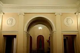 Après la Grande Guerre patriotique, le cinéma est entièrement reconstruit pour en faire le théâtre russe, selon les plans de l'architecte Mikhaïl Baklanov[2]. La façade est ornée d'un fronton à la grecque avec un portique hexastyle corinthien.
