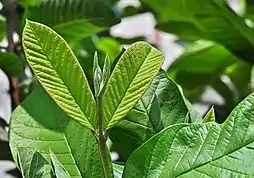 Comme de nombreuses feuilles végétales utilisées en ethnomédecine, la feuille du goyavier est riche en antioxydants[7] (polyphénols [8], saponines, terpénoïdes, stéroïdes, flavonoïdes[9] et hétérosides, polysaccharides, vitamines[10]), en proportion variable selon la présentation (feuille fraiche, sèche [11],[12], pulvérisée etc.) et le type d'extrait. Les analyses les plus fouillées sont celles de l'huile essentielle de feuille de goyavier ou huile essentielle de goyave [13],[14] (rendement 0,66% ou 1,24% en cas d'extraction par hydro-distillation assistée par micro-ondes) qui est, elle aussi, utilisée en médecine traditionnelle[15],[16] pour ses effets antimicrobiens, anti-nociceptifs, insecticides, anticancéreux et anti-inflammatoires[17] et en phytopharmacie sous forme encapsulée[18]. Trois composés organosulfurés typiques du parfum de goyave y ont été isolés[17], les principaux composés de l'huile de feuilles sont le véridiflorol (36,4%) et le trans-caryophyllène (5,9% )[19]. Les composés actifs ont été méthodiquement identifiés (2019) en utilisant chromatographie en phase liquide à haute performance[20].