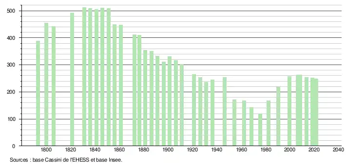 L'évolution du nombre d'habitants est connue à travers les recensements de la population effectués dans la commune depuis 1793. Pour les communes de moins de 10 000 habitants, une enquête de recensement portant sur toute la population est réalisée tous les cinq ans, les populations légales des années intermédiaires étant quant à elles estimées par interpolation ou extrapolation[32]. Pour la commune, le premier recensement exhaustif entrant dans le cadre du nouveau dispositif a été réalisé en 2008[33].
