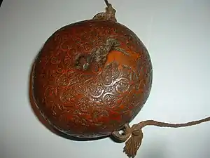 Cette gourde est faite dans une zuccaghia (petit potiron) de 13 cm de diamètre, elle est ciselée au couteau. Sur l’une des faces est représentée un couple d’amoureux surmonté d’un angelot symbole de l’amour. La femme est allongée sur le sol et tend les bras vers un homme qui semble vouloir partir mais tourne la tête vers elle.