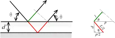 Le théorème de Malus est utilisé pour calculer la différence de marche entre deux rayons lumineux. Le schéma ci-contre représente un interféromètre de Michelson en configuration de lame d'air. Après « repliement » de l'interféromètre, on obtient un miroir fictif parallèle à un miroir réel. Ici sont représentés deux rayons confondus, un réel se réfléchissant dans le miroir réel et un fictif se réfléchissant dans le miroir fictif. Le théorème de Malus ne permet pas d'affirmer que la droite tracée en pointillés gris sur le schéma, étant orthogonale aux deux rayons, est une surface d'onde (car le rayon rouge subit deux réfractions pour une réflexion et le rayon vert seulement une réflexion). Cependant si on considère le principe du retour inverse de la lumière, dans le cas hypothétique d'une source à l'infini dans la direction des flèches alors le théorème de Malus permet de dire que la droite tracée en pointillés gris sur le schéma est une surface d'onde pour cette source hypothétique. Le calcul de la différence de marche entre ces deux rayons se résume alors à la différence de longueur entre les lignes rouge et verte.