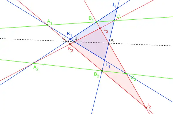 Une démonstration analogue peut être faite, en modifiant les conditions supplémentaires, avec le triangle (en rouge sur la figure). Dans ce cas, les trois droites , et (en rouge sur la figure) échangent leur rôle avec les trois droites , et (en bleu sur la figure).