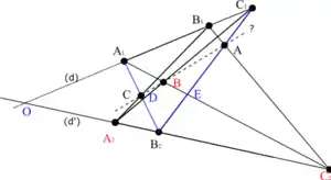 Or, une application projective d'une droite sur une autre est entièrement déterminée par l'image de trois points distincts. Les transformations q o p et r coïncident sur , D et . Elles sont donc égales et . Les points A, B et C sont donc alignés[1].