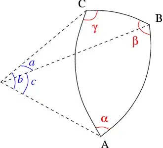 Dans un triangle sphérique (voir figure ci-contre) dessiné sur la sphère de rayon R, dont les côtés ont pour dimensions angulaires a, b et c, on note le demi-périmètre