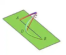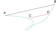 En mathématiques, et plus précisément en analyse, le théorème de la corde universelle, ou théorème des cordes universelles, dû à Paul Lévy[1], décrit dans sa version générale une propriété des courbes planes continues joignant un point à un point ; il répond à la question de savoir si on peut trouver sur cet arc des points et tels que la corde ait une longueur donnée et soit parallèle à la corde . Le théorème affirme que cette corde existe pour tout arc joignant à si et seulement si la longueur est un diviseur entier de la longueur (pour un arc particulier, il existe en général d'autres cas d'existence de la corde , comme dans l'exemple ci-contre. L'expression « corde universelle » signifie que le résultat s'applique à un arc quelconque).
