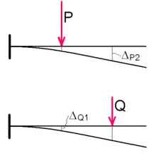 Considérons une poutre horizontale, sur laquelle on choisit deux points 1 et 2 arbitrairement, à cela près qu'ils doivent être distincts des points d'appui (ce qui donnerait, cela dit, un résultat exact, mais trivial). Appliquons une force verticale P au point 1 et notons la flèche au point 2 ; puis, ayant supprimé la charge P, appliquons une force Q au point 2, ce qui produit une flèche au point 1. Le théorème de Maxwell-Betti indique que dans ces conditions :
