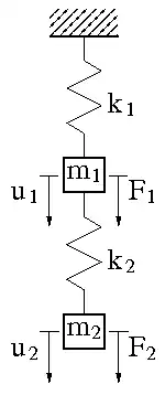 Soient deux masses, de poids respectifs F1 et F2, reliées par deux ressorts de raideurs respectives k1 et k2 et suspendues au plafond du laboratoire. À l'équilibre, l'allongement des ressorts est donné par: