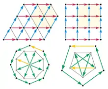 Considérons maintenant une rotation d'ordre 8 et les vecteurs de translation entre des points adjacents du polygone (en noir sur la figure). Un vecteur de translation doit laisser le réseau invariant lors de l'application de la translation. Si un vecteur de translation existe entre deux nœuds quelconques du réseau, alors ce vecteur doit être présent partout dans le réseau. On peut alors placer l'origine de tous les vecteurs correspondant aux côtés du polygone sur un point du réseau. Ces vecteurs deviennent des vecteurs radials et la symétrie d'ordre 8 impose la présence d'un octogone régulier de points autour du barycentre. Cependant, ceci est impossible, car la taille du nouveau polygone est environ 80 % de celle du polygone de départ. La réduction de la taille du polygone par applications successives de cette procédure est illimitée : la même construction peut être répétée avec le nouvel octogone et ainsi de suite jusqu'à ce que la distance entre deux points devienne infiniment petite. Ainsi, aucun réseau discret ne peut posséder une symétrie rotationnelle d'ordre 8. Le même argument s'applique à toute rotation d'ordre k avec k > 6.