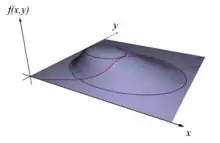 Le théorème des extrema liés[Note 2] indique qu'en chaque point a de S où f est extrémale, la différentielle de f est une combinaison linéaire des différentielles des gi. Le théorème des fonctions implicites permet de montrer simplement ce résultat[Note 2], en considérant localement S comme le graphe d'une fonction φ définie sur un ouvert V du noyau de dg(a). Le problème se ramène ainsi à l'étude des extrema ordinaires de la fonction z ↦ f(z, φ(z)), et l'on sait qu'une condition nécessaire d'extremum en un point de V est la nullité de la différentielle de cette fonction en ce point. C'est en répercutant sur f et g cette condition qu'on aboutit au résultat.