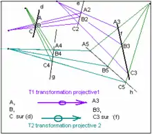 - T1() = T2(), ce qui démontre l'unicité d'une éventuelle transformation projective T1 qui transforme A B C en A3, B3 C3.