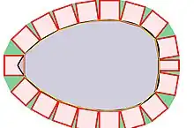 Enfin, le sens à donner à l'expression « mesure de la frontière » n'est pas aussi simple, à partir de la dimension 3, que dans le plan. Dans le plan, définir la longueur d'une courbe est aisé avec l'approche de Jordan, on considère la borne supérieure de l'ensemble des lignes polygonales sont les sommets sont ordonnés et situés sur la courbe (cf. l'article « Longueur d'un arc »). À partir de la dimension 3, cette démarche n'est plus possible : il existe des suites de polyèdres dont les points sont tous sur la surface d'une portion de cylindre située entre deux plans parallèles et dont la suite des aires diverge. Un exemple est donné sur la figure de droite. La notion de forme volume permet bien de définir une mesure (n – 1)-dimensionnelle pour la frontière du compact, elle suppose cependant que la frontière est suffisamment lisse, c'est-à-dire qu'elle définisse une variété de dimension n – 1 de classe C2.