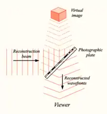 Quand un hologramme – résultant d'une figure d'interférence entre deux portions de lumière laser – est impressionné sur une pellicule photographique, celle-ci peut être coupée en deux sans jamais perdre une seule moitié de l'image d'origine, qui reste complète (bien qu'avec une certaine perte de résolution)[32],[33]. L'image complète persiste même si les deux moitiés de la pellicule sont elles-mêmes sectionnées en de plus petits éléments. Chaque partie de la pellicule contient en effet tout l'espace nécessaire à la restitution complète de l'image. Dans l'analogie de l'hologramme, la surface de la pellicule photographique contenant les informations visuelles devient alors la métaphore de l'ordre implicite, tandis que l'hologramme lui-même représente l'ordre explicite, c'est-à-dire l'explicitation dans notre réalité d'un ordre caché où chaque partie renferme l'ordre total. Le « mouvement holographique » est représenté quant à lui par la lumière laser projetée sur la plaque photographique, illustrant le caractère dynamique de la réalité holographique[34].