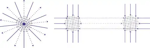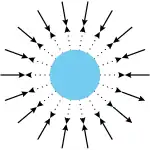 Étant donné que l'on suppose que certaines si ce n'est toutes les particules gravifiques convergeant vers un objet sont soit absorbées soit ralenties par l'objet, l'intensité du flux de particules gravitiques émanant de la direction d'un objet massif est moindre que celle du flux convergeant vers l'objet. On peut imaginer ce déséquilibre de flux de moment, et par conséquent de la force exercée par quelque autre corps dans le voisinage, comme étant distribué sur une surface sphérique centrée sur l'objet (illustration P4). Le déséquilibre de flux de moment sur une surface entièrement sphérique entourant l'objet est indépendante de la sphère encerclante, alors que la surface de la sphère augmente comme le carré du rayon. Par conséquent, le déséquilibre de moment par unité de surface diminue comme l'inverse du carré de la distance.