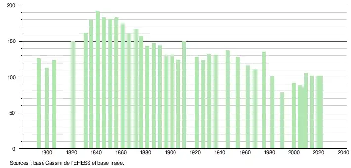 L'évolution du nombre d'habitants est connue à travers les recensements de la population effectués dans la commune depuis 1793. Pour les communes de moins de 10 000 habitants, une enquête de recensement portant sur toute la population est réalisée tous les cinq ans, les populations légales des années intermédiaires étant quant à elles estimées par interpolation ou extrapolation[16]. Pour la commune, le premier recensement exhaustif entrant dans le cadre du nouveau dispositif a été réalisé en 2004[17].