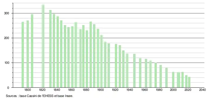L'évolution du nombre d'habitants est connue à travers les recensements de la population effectués dans la commune depuis 1793. Pour les communes de moins de 10 000 habitants, une enquête de recensement portant sur toute la population est réalisée tous les cinq ans, les populations légales des années intermédiaires étant quant à elles estimées par interpolation ou extrapolation[15]. Pour la commune, le premier recensement exhaustif entrant dans le cadre du nouveau dispositif a été réalisé en 2007[16].
